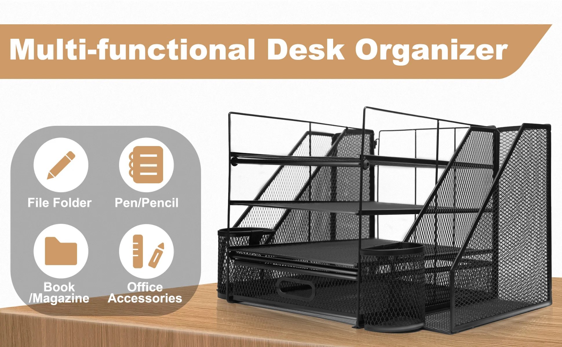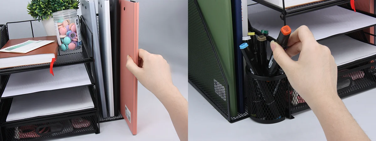 Beyond holding a diverse array of folders, the twin file holders elegantly present books and magazines in an upright manner. The suspended pencil enclave is designed to host up to 30 pens, ensuring your favorite writing tools are always within reach.